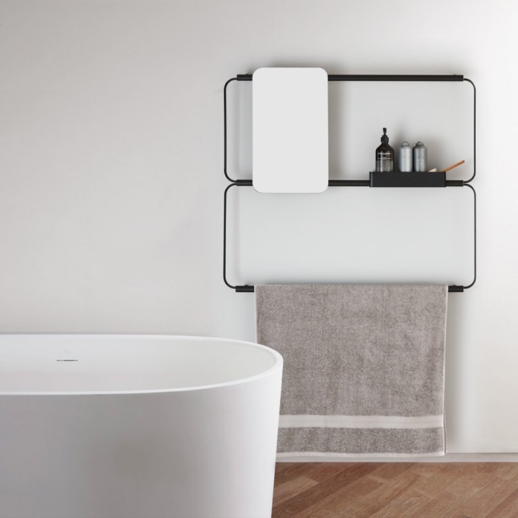 ヌードはスペインのデザイナーMUTによって設計されたアクセサリーシステムです。ブラックとブラスのグリッドに、ミラーやコンテナと呼ばれるシェルフを組み合わせることで、機能的な仕切りパネルやシェルフシステムに変わります。シーンは自由、化粧鏡として、タオルレールとして、収納として、水まわりにもリビングスペースにもマッチします。