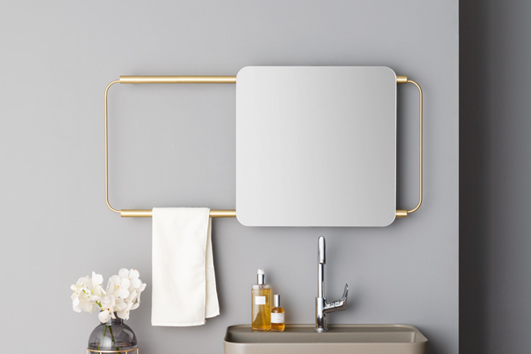 自由自在に組み合わせを楽しめるアクセサリーシステム・ヌード ヌードは、スペインのデザイナーMUTによって設計された、壁掛け式アクセサリーシステムです。ブラックとブラスのグリッドに、ミラーやコンテナと呼ばれるシェルフといったアクセサリーを組み合わせて、機能的な仕切りパネルやシェルフシステムに変わります。皆様のニーズに応じてタオルハンガーになったり、化粧鏡になったり、収納棚になったり…。 水まわりやリビングを自分好みにデザインできます。
