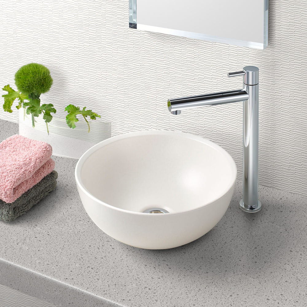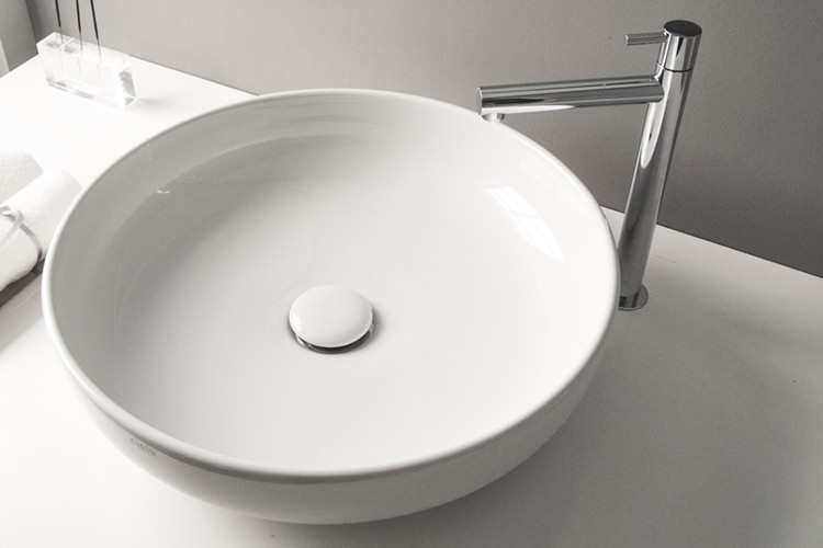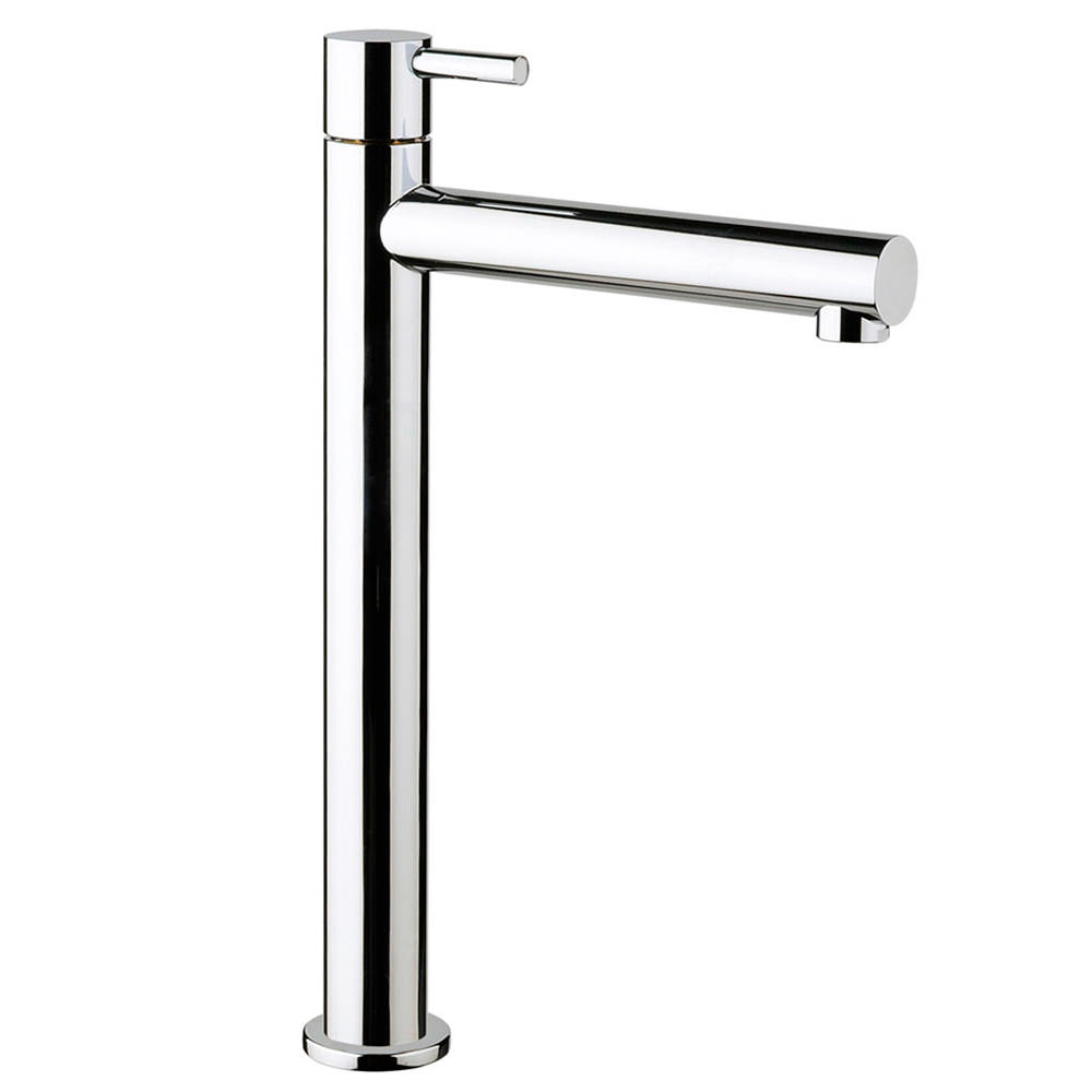 円柱だけで構成されたシンプルなフォルムの単水栓です。背が高い設計なので、小型の手洗器にセットしても十分な広さを確保できます。