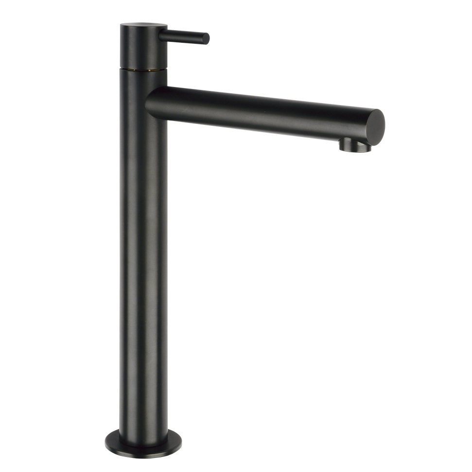 円柱だけで構成されたシンプルなフォルムの単水栓です。背が高い設計なので、小型の手洗器にセットしても十分な広さを確保できます。