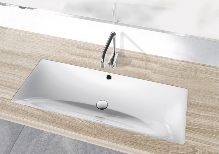当社取扱いのアンダーカウンター洗面器として最も大きな90センチ×35センチのタップリとした開口サイズ。ゆとりのボウルサイズで、洗顔時などの水の飛び散りは、ほぼボウル内でカバーすることが可能です。大型ボウルでありながらカウンター面がすっきりとおさまるので圧迫感がありません。内部は柔らかな曲面になっており、お掃除もしやすくなっています。