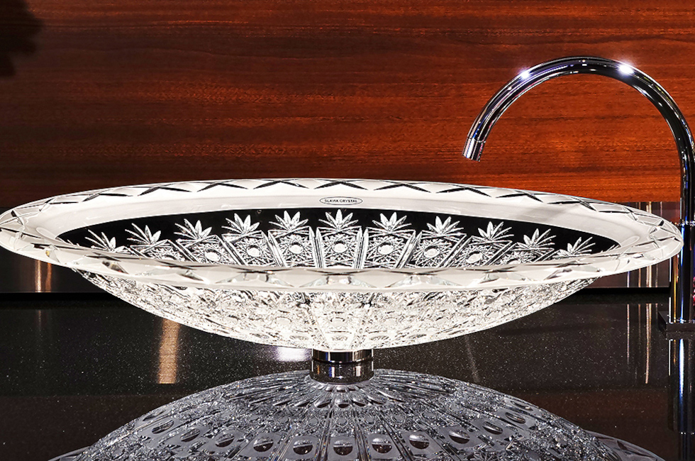 熟練の職人によるカッティングが美しいクリスタル洗面ボウル。 洗面としても十分な668mmサイズに緻密なカッティングが隅々まで施されています。