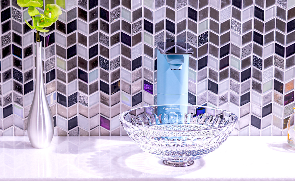 古代ローマの軍人・政治家 Julius Caesar(ジュリアス・シーザー)をモチーフにした、大胆かつ繊細なカッティングデザイン。 大きなカットからは透明な光が入り、繊細なカットでは輝きが映り込みます。透過と模様のバランスが美しく、存在感を感じられる逸品です。洗面スペースのイメージに合わせて4種類のカラーからお選びいただけます。