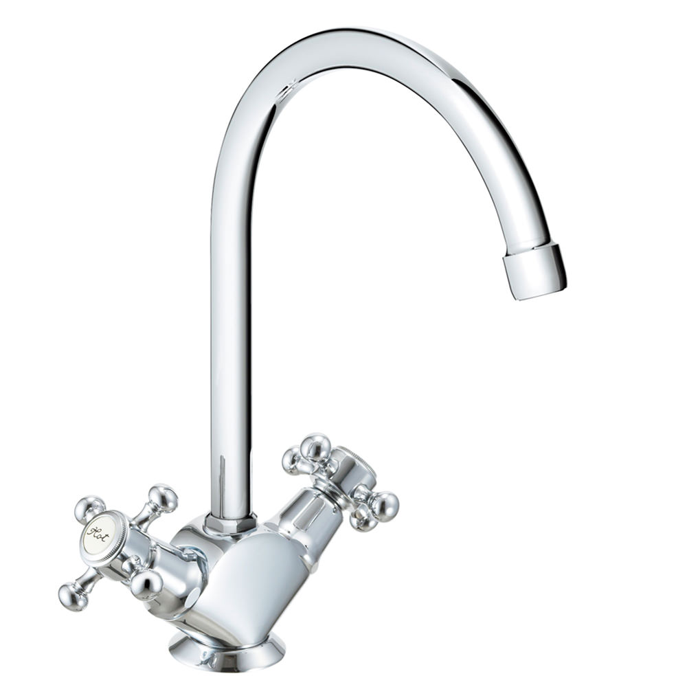 美しいカーブを描く背が高いスパウトは、大きな鍋もストレスなくお使いいただけます。2ハンドル水栓は一見、不便に見えますが調理のシーンで「水だけを出したい」という時に便利です。クラシックデザインのハンドルは根強い人気があります。