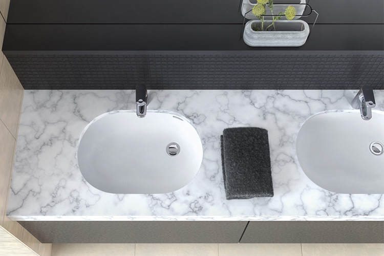 排水位置を右奥に配置することで、カウンター下の収納スペースも確保しやすい大容量のオーバル型洗面ボウルです。