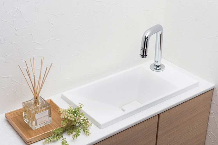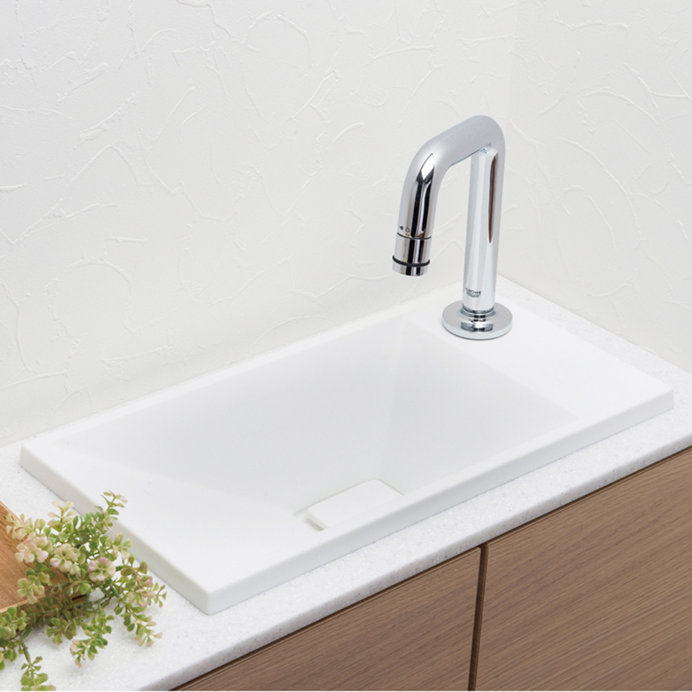 奥行き250mmカウンターに納まるコンパクトサイズ。排水口をすっきり美しく見せる目皿カバー付きです。