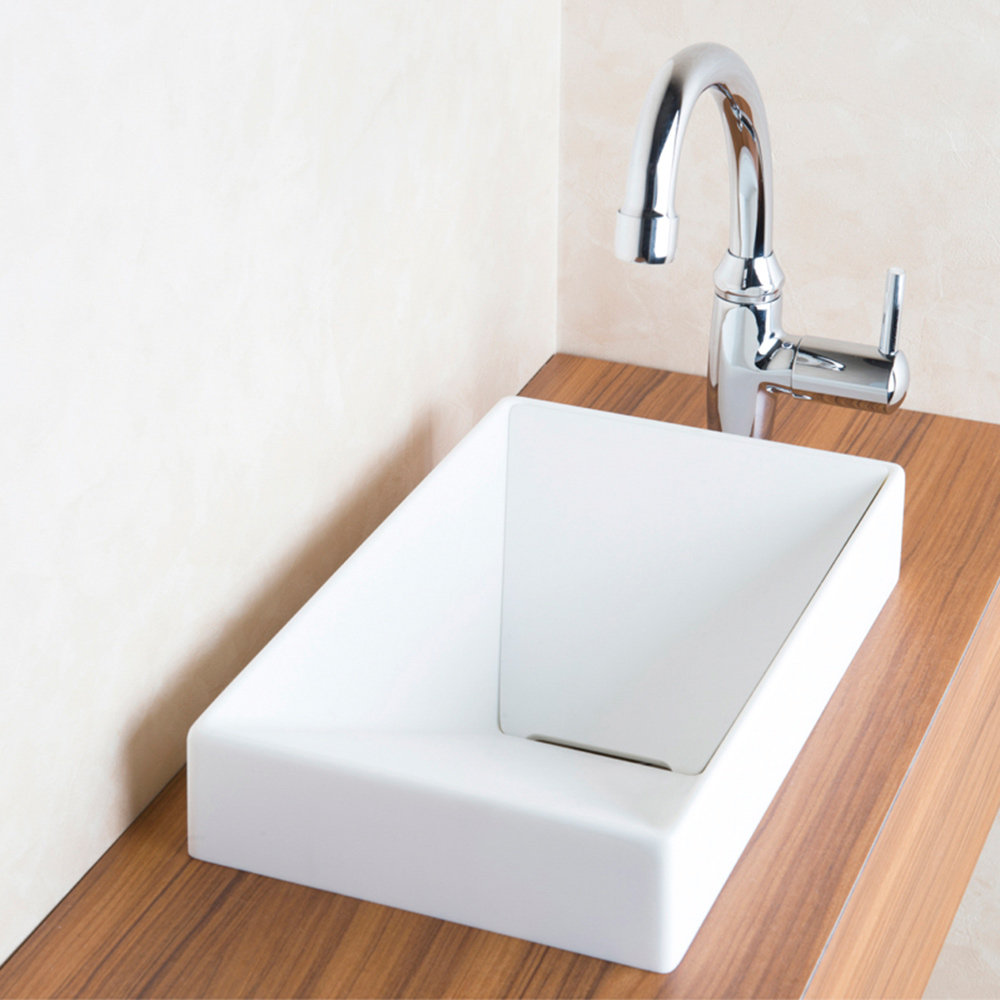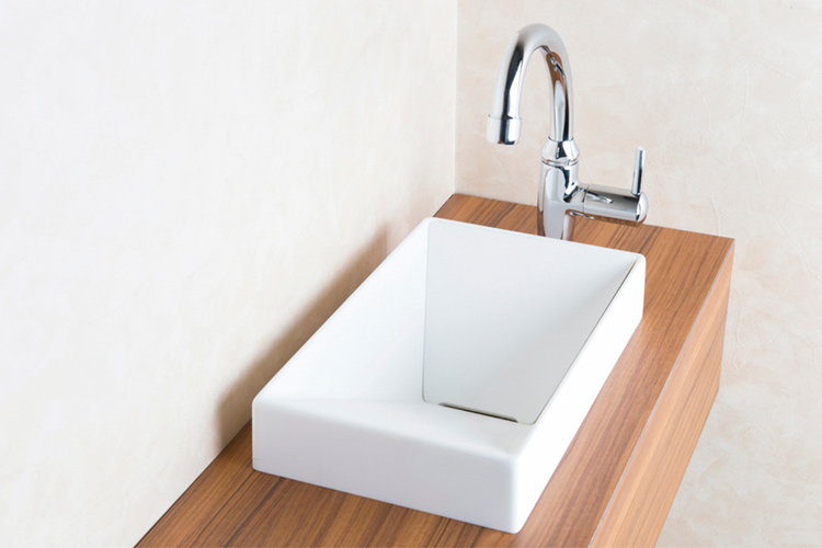 エッジが美しくスタイリッシュな置き型の手洗器。軽やかな印象の樹脂製です。