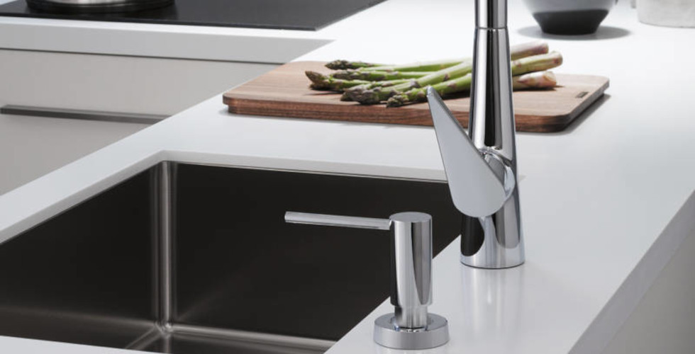 キッチンシンクやカウンターに設置可能なソープディスペンサー。様々なカラーやデザインから選べキッチン水栓とのコーディネートも可能です。