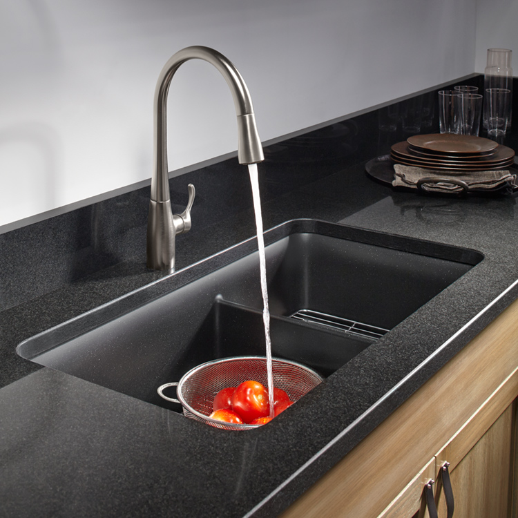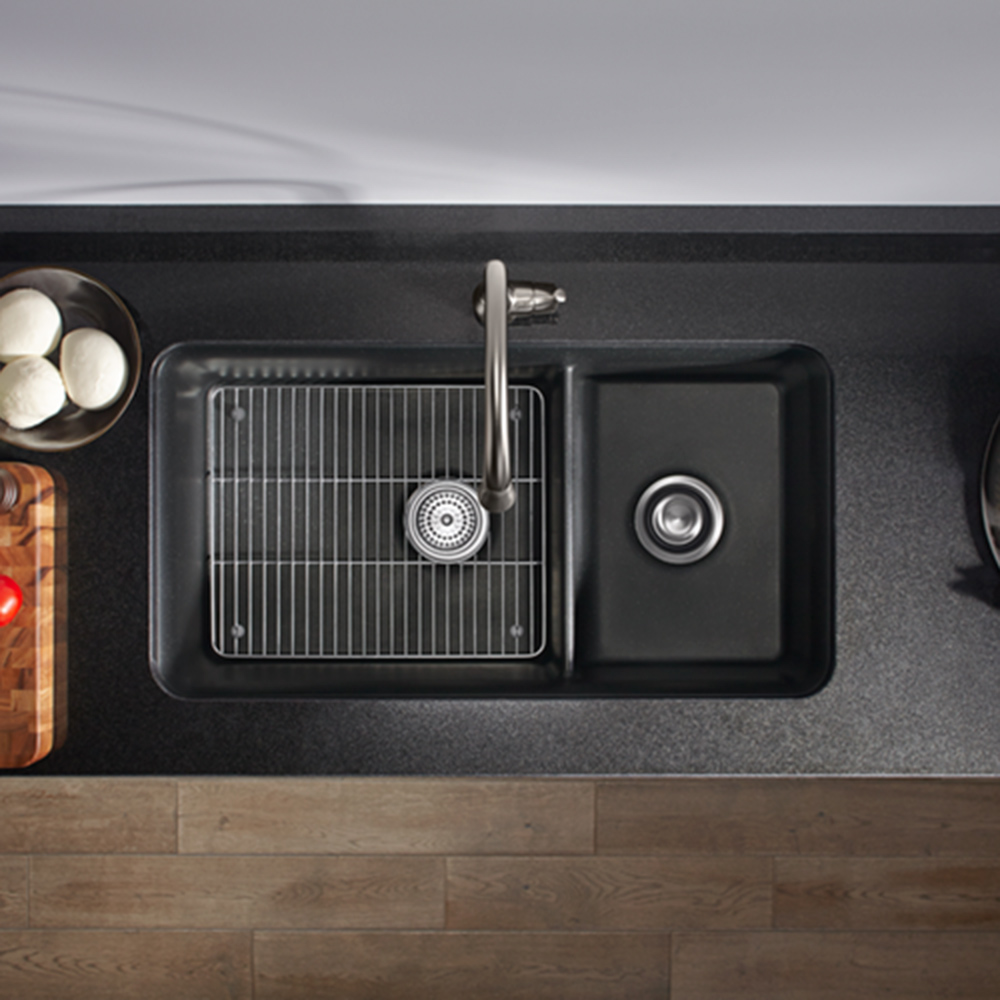 KOHLER が独自に開発した「ネオロック」は、高い耐久性を持つ全く新しい複合素材です。強力エポキシ樹脂と微細な石英(クォーツ) 粒子を配合することで、従来のアクリルレジン配合素材よりも衝撃に強く、また約 407 ℃までの耐熱性を実現。傷や色あせにも強く、まるで新品のような滑らかさがいつまでも続きます。 ホーロー素材よりも軽量で扱いやすいため、簡単に設置可能です。マットな質感とシックなカラーバリエーションで、ワンランク上のキッチンを演出します。