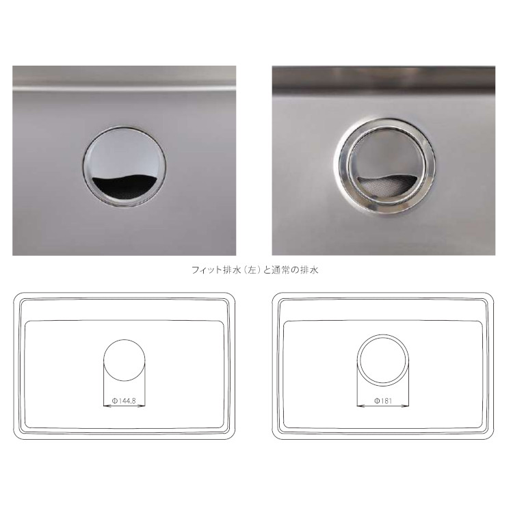 お手入れしやすい「フィット排水」がセットされています。排水プレ ートがシンクにフィットしており、段差がないフィット排水。清掃性に優れ、一体感のあるスマートな印象に仕上がります。排水プレ ートがシンクにフィットしており、段差がないフィット排水。清掃性に優れ、一体感のあるスマートな印象に仕上がります。