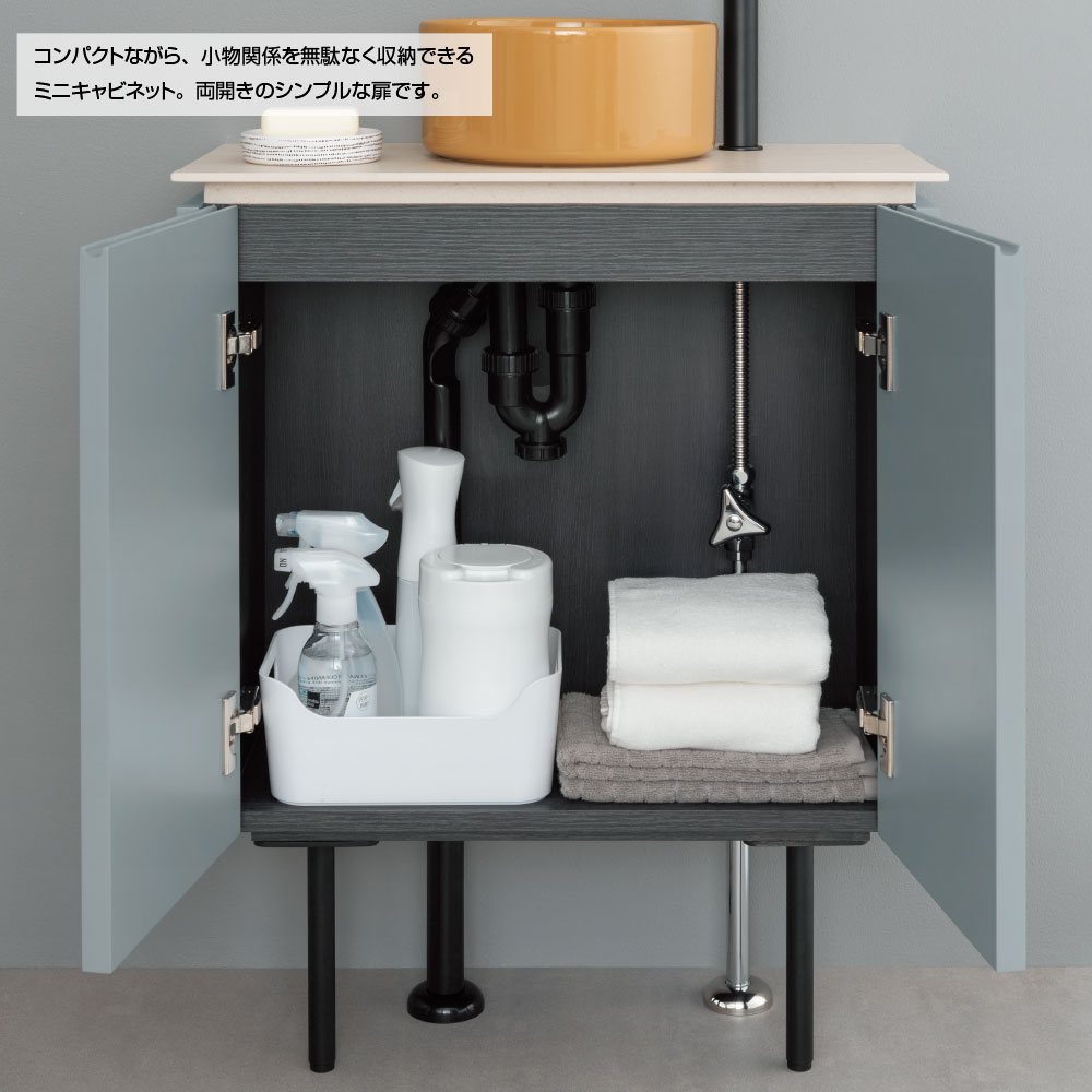 | 商品仕様 | 開き扉(110度開き・ソフトクローズ仕様) 脚部:スチール(2本脚) 手洗いボウル・水栓金具・排水目皿・トラップ・止水栓は別途必要となります。 |
