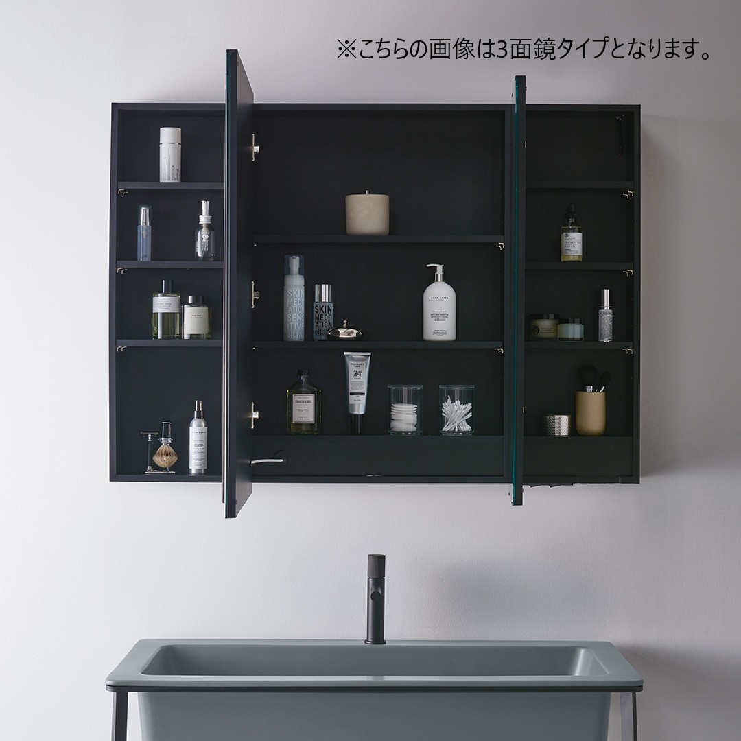 | 商品仕様 | ミラー:5mm厚(防湿加工)・上下ステンレスフレーム F☆☆☆☆対応 設置方法:壁付け(取付金具同梱) 可動棚:3段 扉開き:155°左開き 右底面にコンセント2口(合計1200Wまで) 右底面にLEDライトと曇り止めヒーター連動のON/OFFスイッチ1個 消費電力:LED:10.36W×2本=20.72W ヒーター:6W 合計:26.72W 定格光束:1258lm(629lm/LED1本×2本) 固有エネルギー消費効率47.1lm/W |