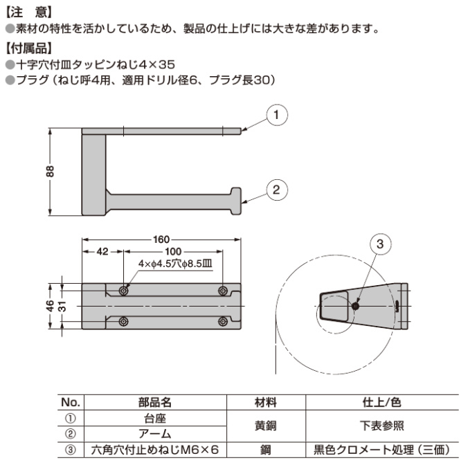 | 商品仕様 | 十字穴付皿タッピンねじ4×35、プラグ(ねじ呼4用、適用ドリル径6、プラグ長30)付属 耐荷重:5.1kgf |