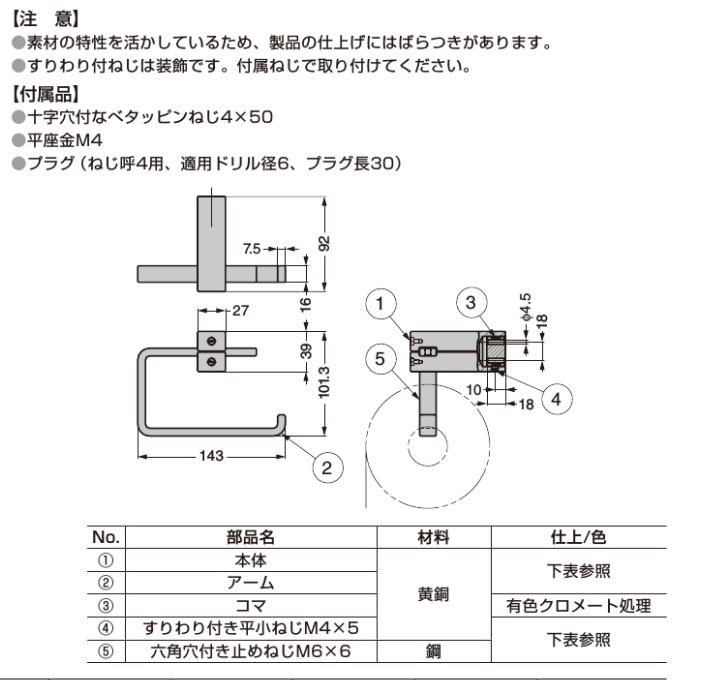 | 商品仕様 | 十字穴付なべタッピンねじ4×50、平座金M4、プラグ(ねじ呼4用、適用ドリル径6、プラグ長30)付属 耐荷重:5.1kgf |