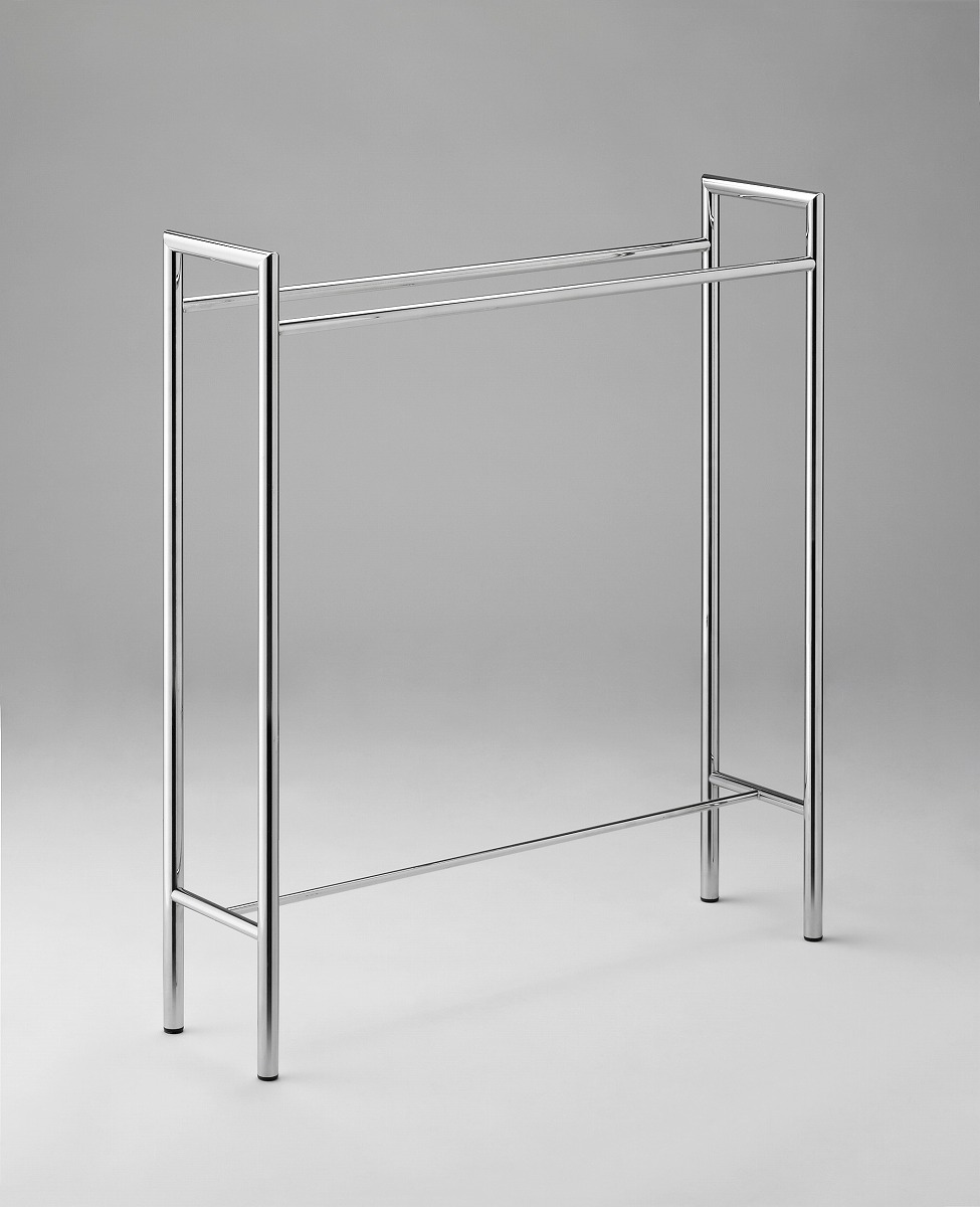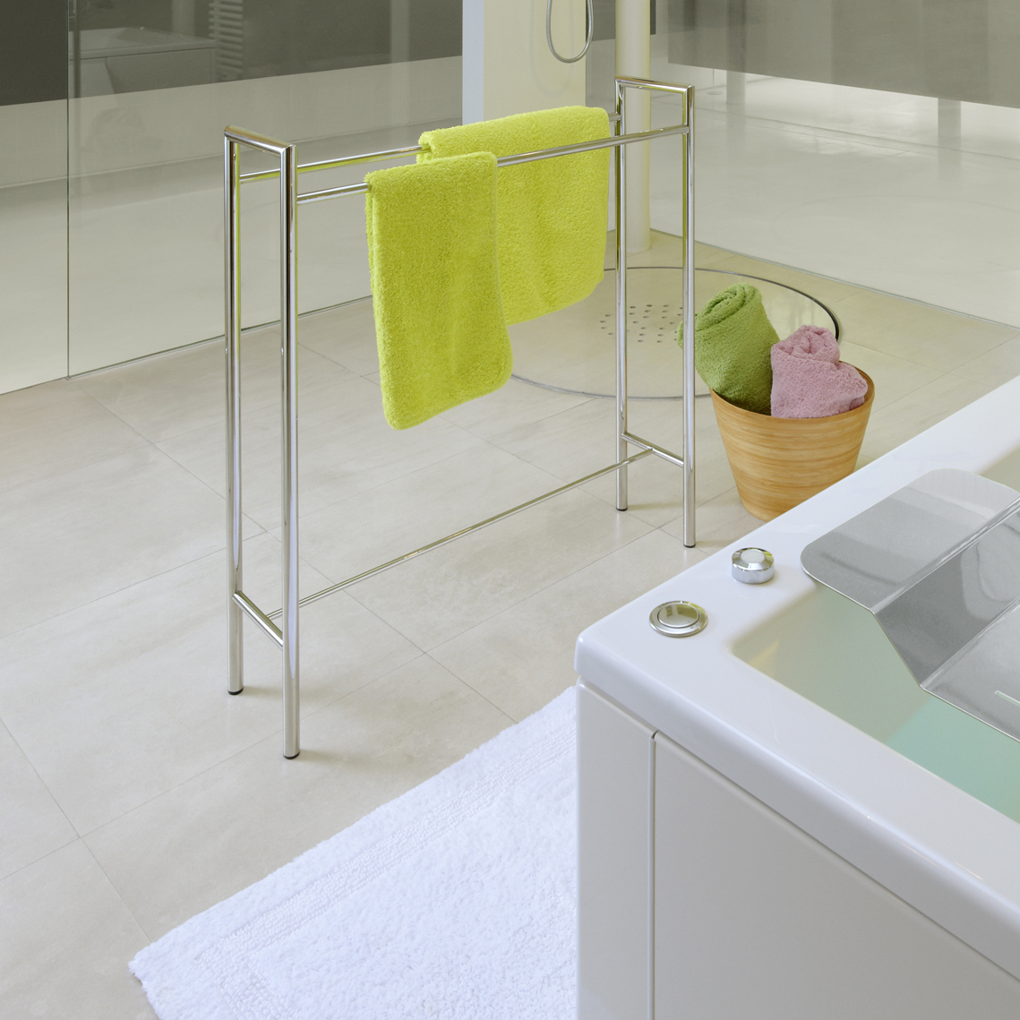 バスルームにさり気なく置かれているアクセサリーにも機能的で絶妙なサイズバランス、高品質で美しいデザインを追求しました。こだわりの逸品が区間にアクセントをつけます。バスタオルが2枚掛けられる、自立型タオル掛けです。タオル掛け部は巾728.3でホテルサイズにも対応。ガタツキを軽減する調整シール付き。※全てのタオルに対応しているものではありません。