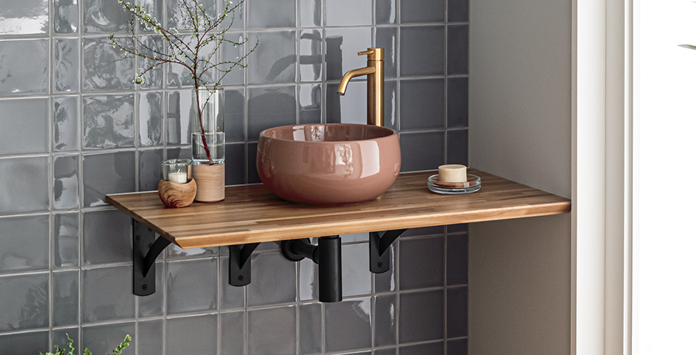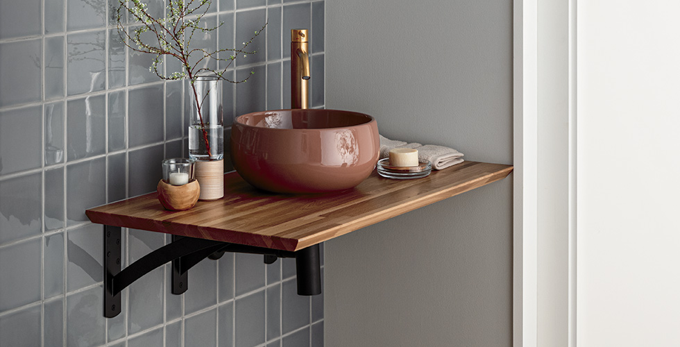 こちらの奥行き500mmタイプは、様々なサイズのボウルに対応可能。無垢の木目がナチュラルかつシンプルに洗面空間にとけこみます。