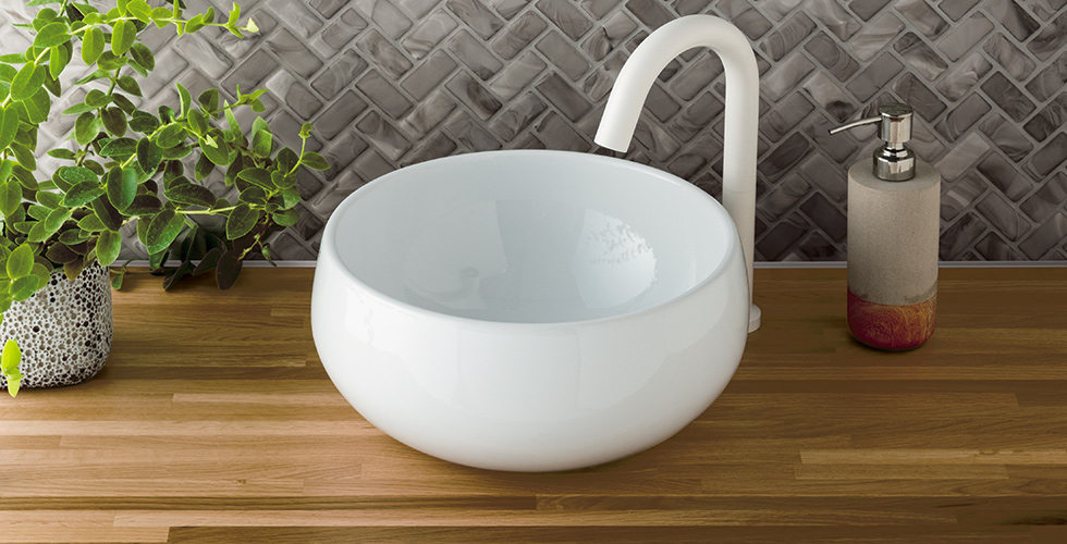 セレノウッドカウンターは、国産の無垢ナラ材を使用し、小さいピースを組み合わせた集成カウンター。反りにくく強度も申し分なく、水栓をボウルの外に置くタイプにも対応。