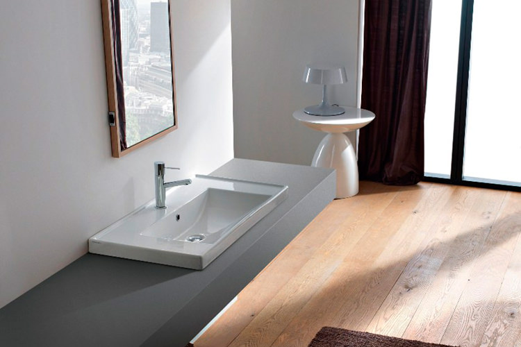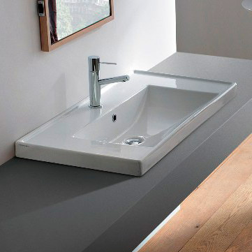 ワイド900mmの大型洗面器。半埋め込みタイプのシンプルなデザインは、カウンターからの高さを抑え、すっきりとした印象を与えます。