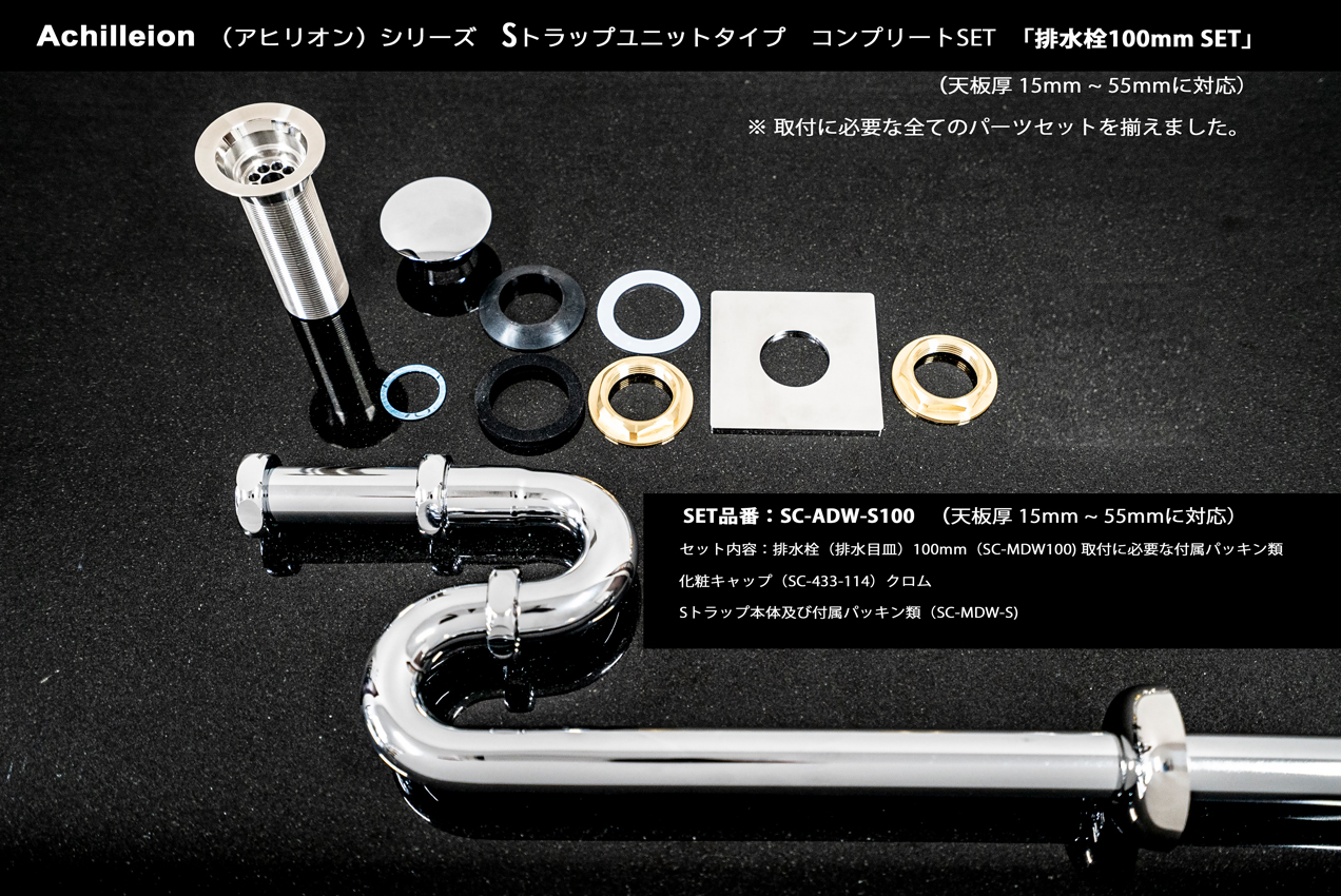 | 商品仕様 | 【セット内容】 排水目皿:SC-MDW100 化粧キャップ:SC-433-114 Sトラップ:SC-MDW-S 取付に必要なパッキン類 |