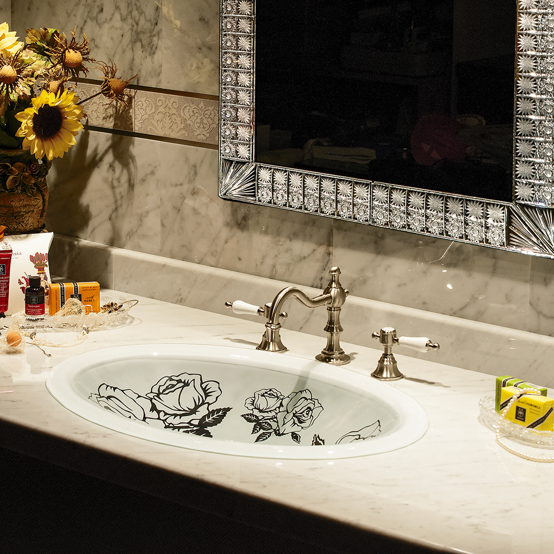 先祖代々受け継がれて来た伝統のボヘミアンクリスタルのカッティング技術による、繊細で美しい輝きは洗面スペースをゴージャスに演出します。