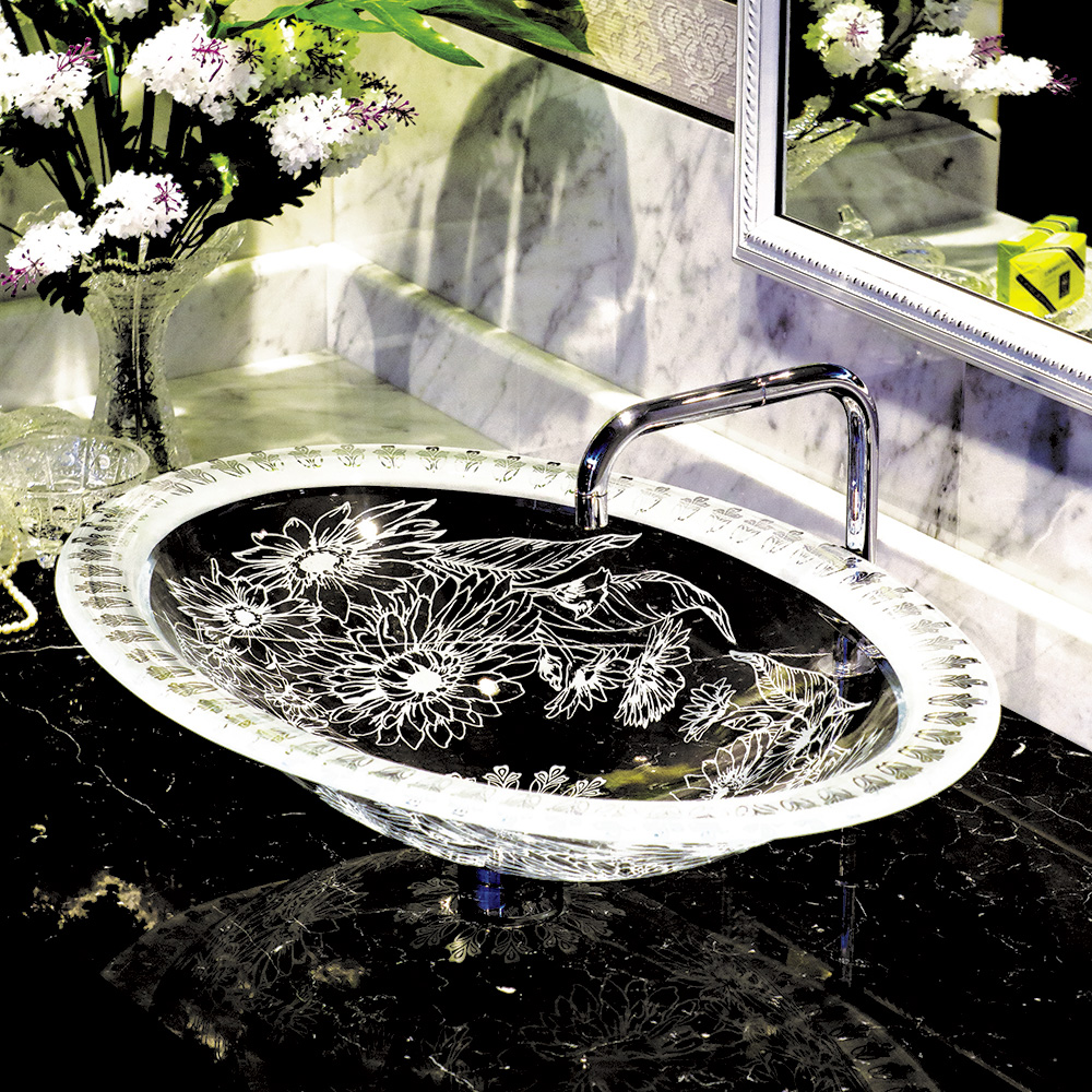 非常に高度なカッティング技術から生まれる洗面ボウルは、どの角度から見ても美しい輝きを放ちます。