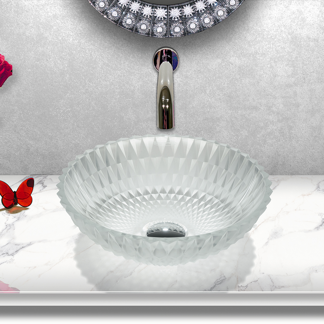 非常に高度なカッティング技術から生まれる洗面ボウルは、どの角度から見ても美しい輝きを放ちます。