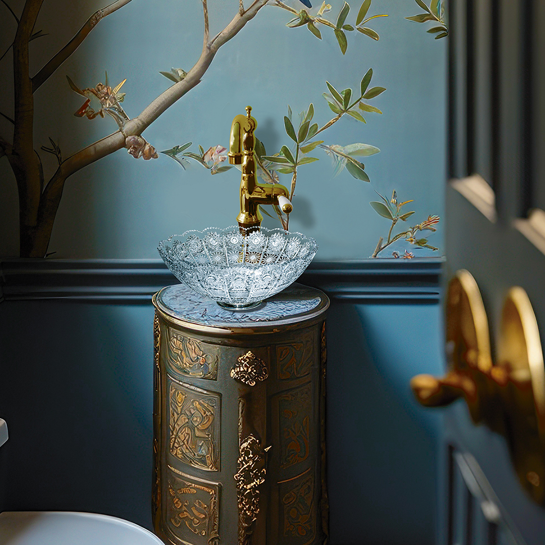 先祖代々受け継がれて来た伝統のボヘミアンクリスタルのカッティング技術による、繊細で美しい輝きは洗面スペースをゴージャスに演出します。