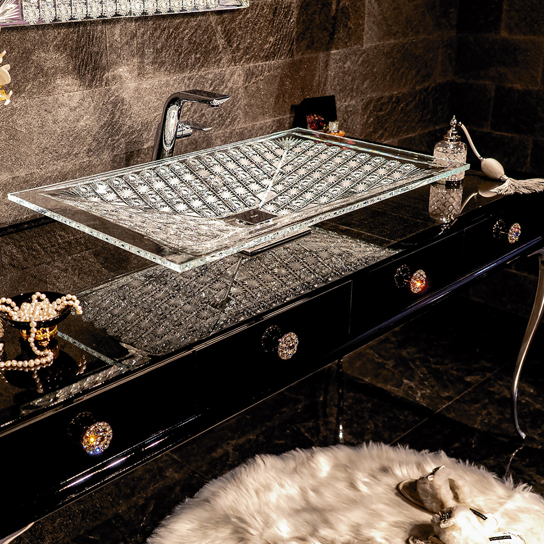 先祖代々受け継がれて来た伝統のボヘミアンクリスタルのカッティング技術による、繊細で美しい輝きは洗面スペースをゴージャスに演出します。