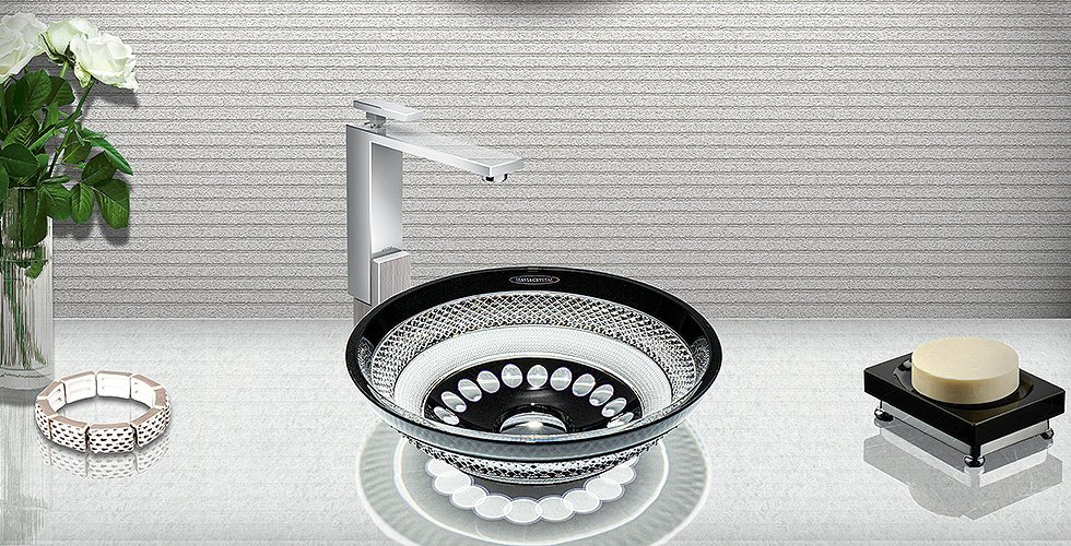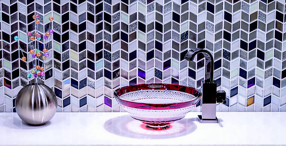 スラヴィアクリスタルならではのカラーコントラストとハンドメイドカットの繊細な輝きが相まって、今までにない洗面空間を演出します。