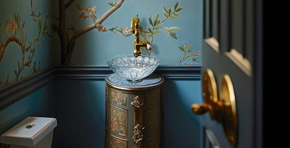 手洗いボウルが芸術的なオブジェとして空間を彩ります。