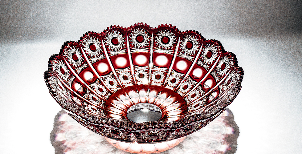 クリスタルガラス本来の美しい輝きとエッジにまでこだわった超繊細なカッティングを更に可憐にデコレーションした、まさに女王のためのモデルです。