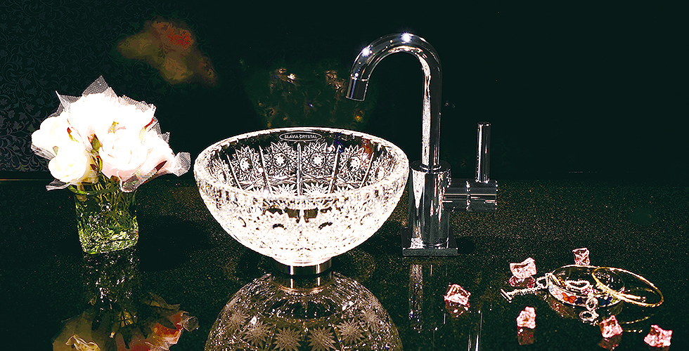 スラヴィアクリスタルの中で最も小さい210mmサイズの手洗器はパウダールームはもちろん、どこに設置頂いても美しく存在感を放ちます。