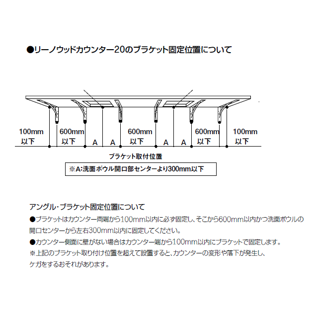●ブラケットはカウンター両端から100mm以内に必ず固定し、そこから600mm以内かつ洗面ボウルの開口センターから左右300mm以内に固定してください。