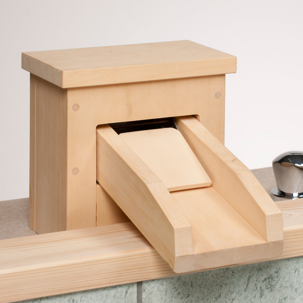 本体内部はFRPやステンレスで覆われており、表面の仕上材に湯が直接触れないため、従来の木製滝口より耐用性に優れています。内部配管済なので、取付作業も簡単です。温泉気分を高める重要なアイテムです。