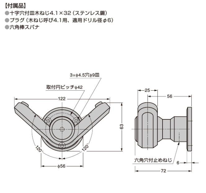 | 商品仕様 | 十字穴付皿木ねじ4.1×32(ステンレス鋼)、プラグ(木ねじ呼び4.1用、適用ドリル径φ6)、六角棒スパナ付属 |