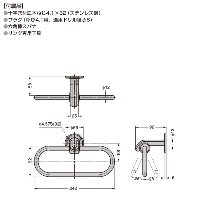 | 商品仕様 | 十字穴付皿木ねじ4.1×32(ステンレス鋼)、プラグ(呼び4.1用、適用ドリル径φ6)、六角棒スパナ、リング専用工具付属 |